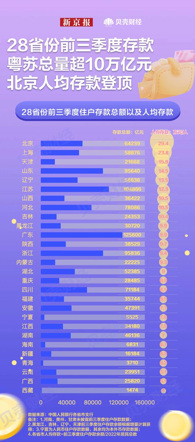 今年前三季度,全国住户存款增长14.42万亿元,总规模达135.62万亿元。截至11月7日,28个省份披露前三季度住户存款数据,广东、江苏住户存款余额超过10万亿元。从人均水平上看,北京人均存款再次登顶,达29.4万元,上海人均存款达23.8万元,位居第二,天津排在第三。