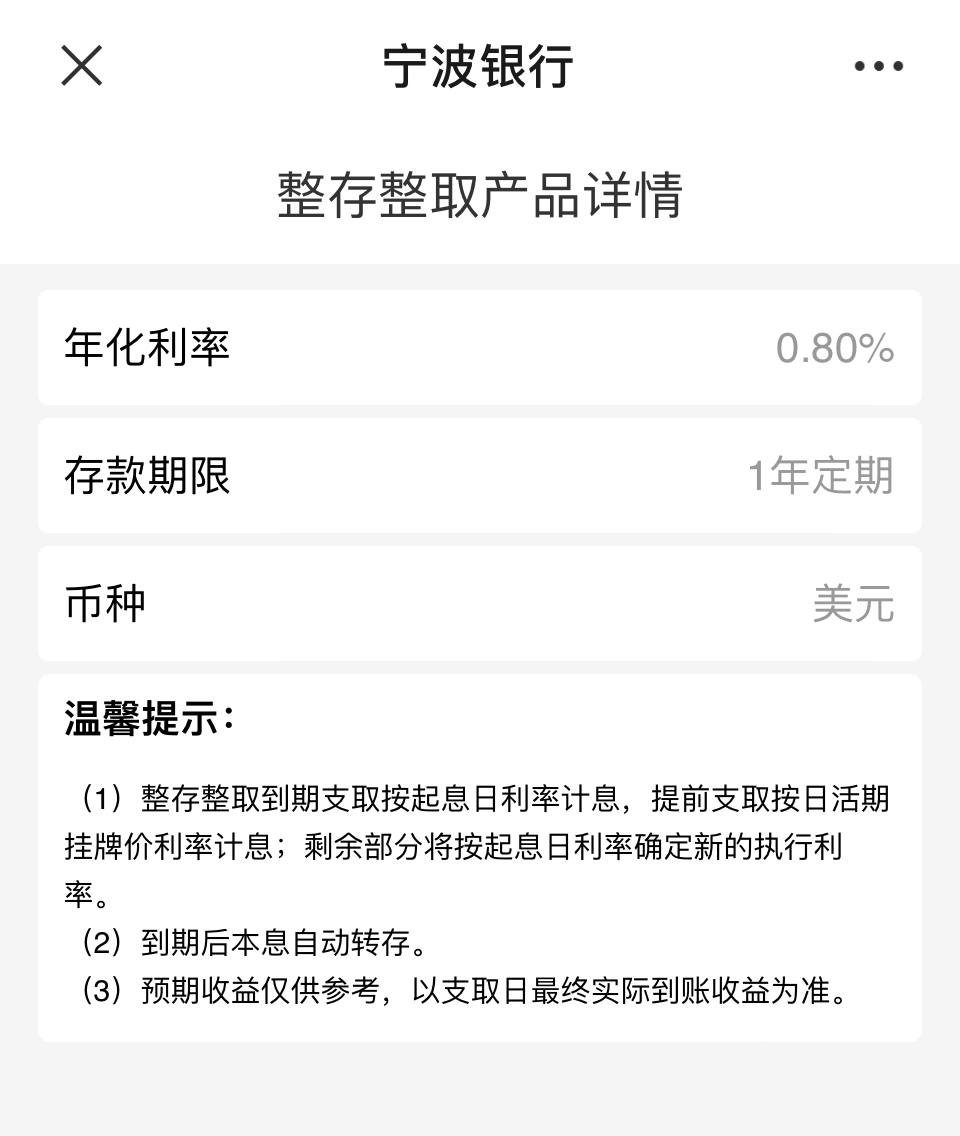 (宁波银行美元存款“整存整取”产品页面)