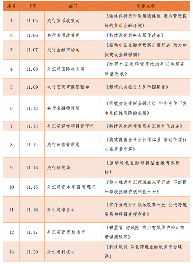 自11月3日起,央行、外汇局接连刊发13篇文章,这些文章被收录在“贯彻落实中央金融工作会议”专栏中,从货币政策、利率市场、人民币国际化、防范化解风险、征信、对外开放、绿色金融、外汇市场管理、跨境贸易外汇便利化改革等多个角度,全方位分析了金融高质量发展面临的形势,部署当前和今后一个时期的金融工作,勾勒出金融强国路线图,释放诸多政策信号。