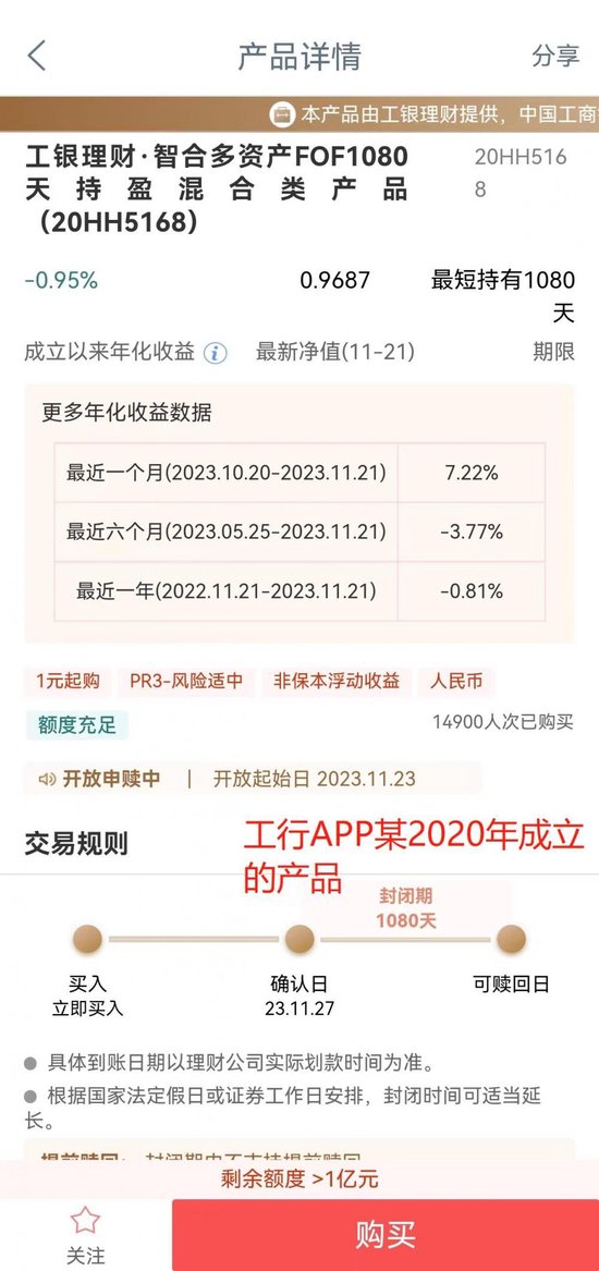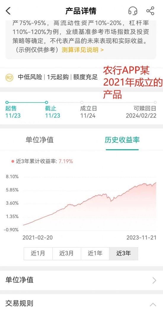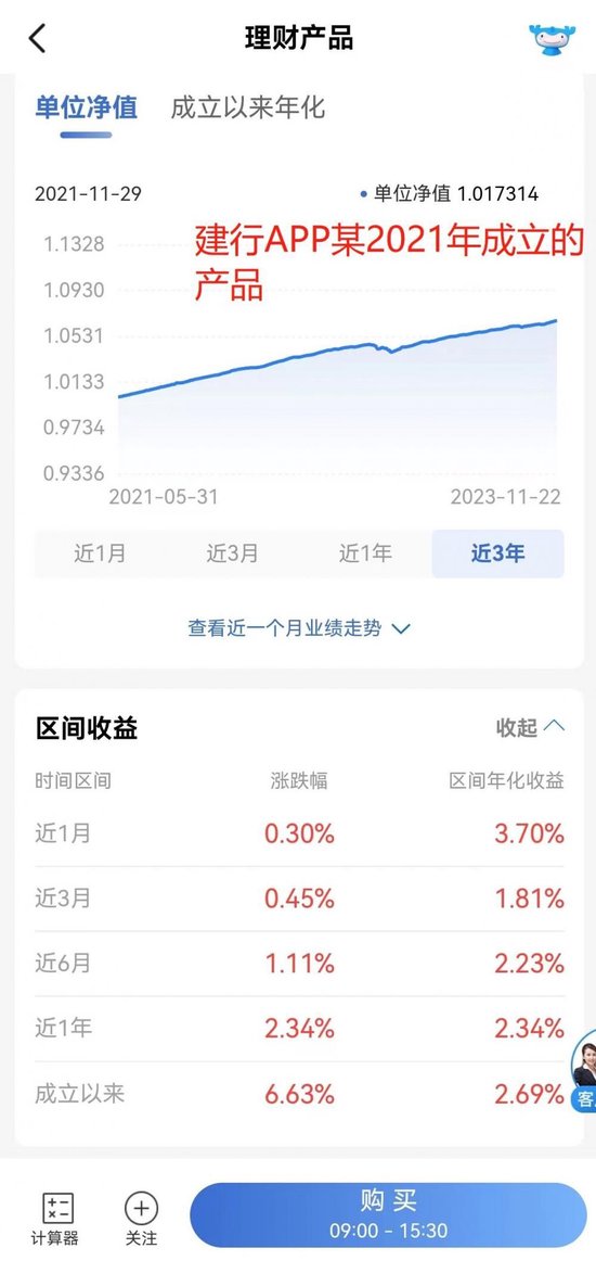 大部分银行APP展示了成立以来的收益率以及1年(含)以内短周期的历史收益率,但运作1年以上的产品当中,普遍存在未展示自产品成立当年开始所有完整会计年度业绩的现象,比如农行APP、建行APP出现了2021年成立的产品没有展示完整会计年度业绩的现象,再比如工行APP有一只2020年成立的产品也未展示完整会计年度的业绩,仅展示成立以来、近1年及以下周期的历史业绩。