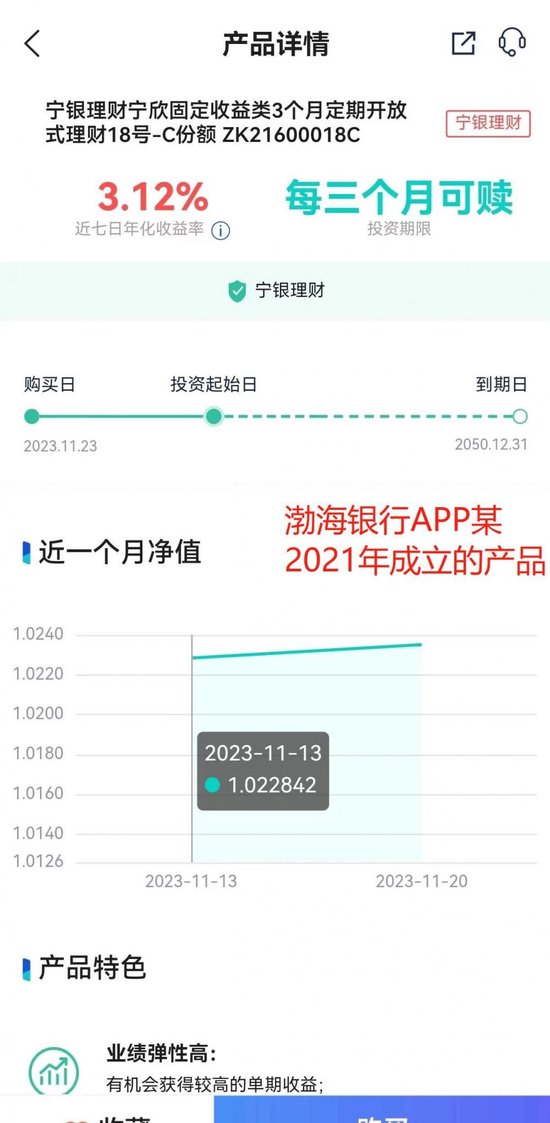 11月23日,21世纪经济报道记者查询了全国性银行APP,发现大部分银行已经从多个时间维度展示历史业绩,只有少数银行比如广发银行、渤海银行未展示多个时间区间历史业绩,渤海银行部分非现金管理类产品展示了近七日年化收益率。