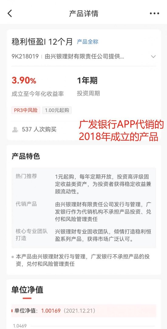 目前大部分银行普遍已经做到从多个维度展示历史业绩,但还有少部分银行APP展示的历史业绩维度较少,比如,广发银行APP代销的一款2018年成立的产品,仅展示了成立至今年化收益率和净值走势,未展示其他维度收益率。渤海银行APP代销的一款2021年成立的非现金管理类产品则仅展示近七日年化收益率,未展示其他维度收益率。记者搜索查询两家银行APP多款产品均存在类似情况。广发银行APP仅部分产品展示了多个时间维度的历史收益率。