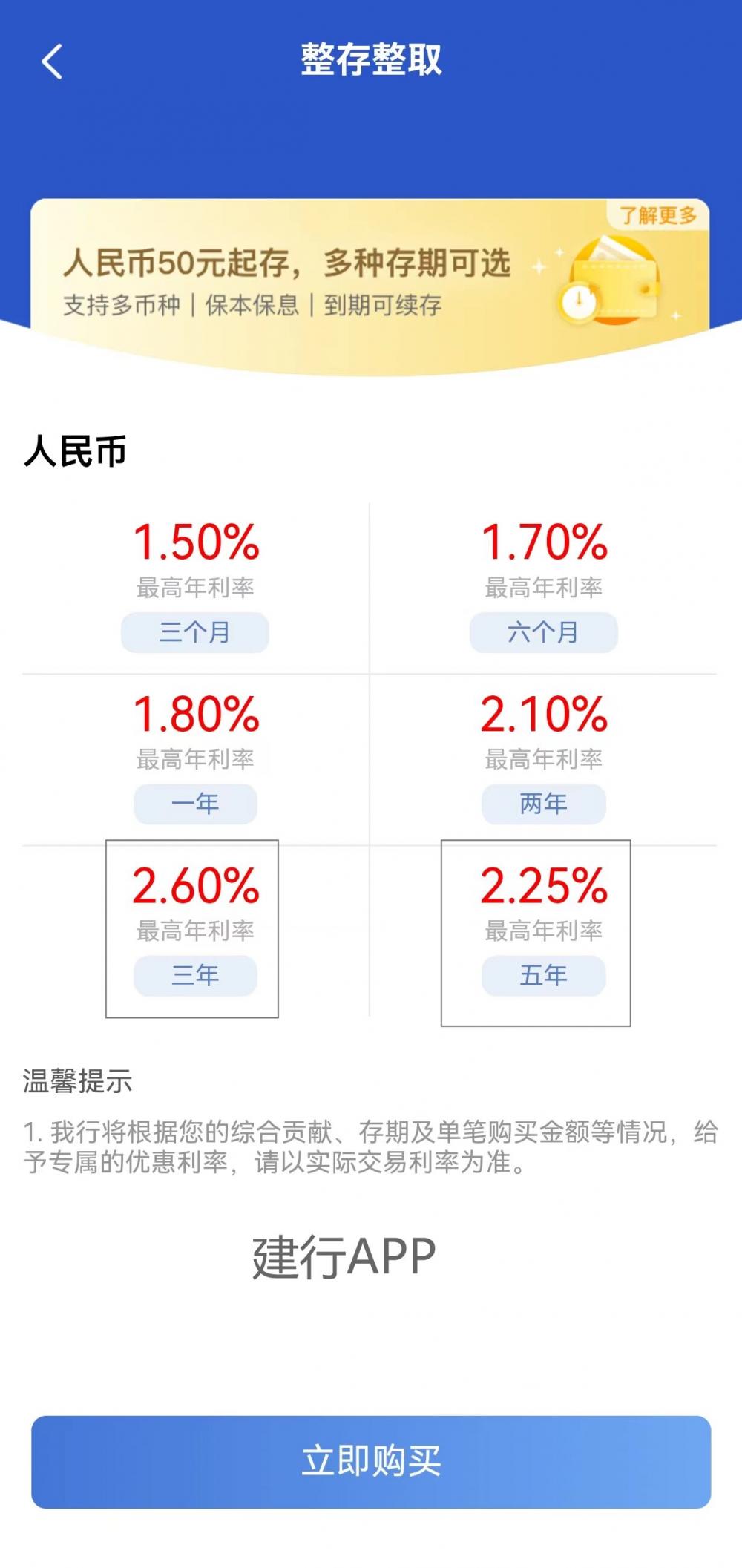 建行人民币存款整存整取3年期最高年利率是2.6%,5年存款最高年利率却只有2.25%;