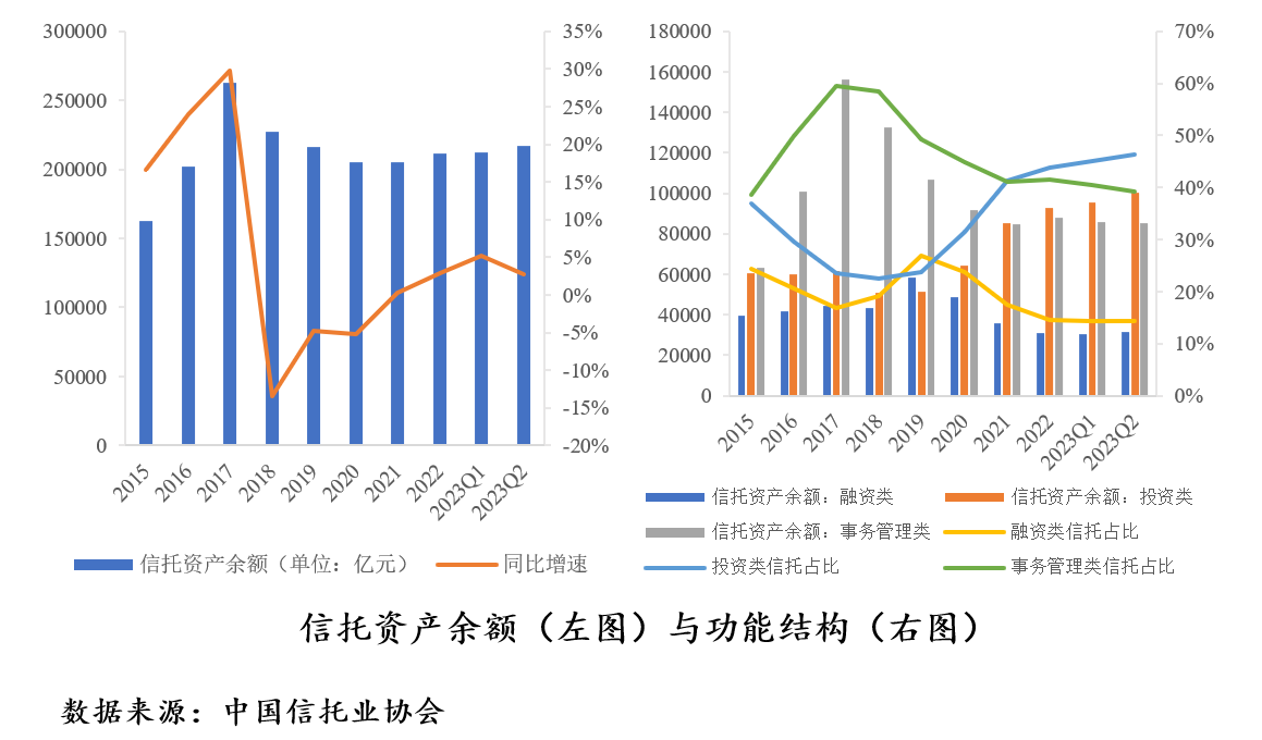 2023年信托资产余额延续回升势头,二季度增长速度有所加快。随着资管新规的落地实施,传统以单一信托为主的通道业务受限,信托公司利用自身制度优势加快推进转型。近年来,信托公司普遍加强渠道建设,注重主动管理能力培养,集合资金信托占比进一步提升,新增信托资产来源结构优化趋势明显,发展质量提升。2017年以来,虽然信托业务规模有所下降,但信托行业的实收资本、信托赔偿准备和未分配利润都保持了平稳增长,应对风险的能力稳步提升。