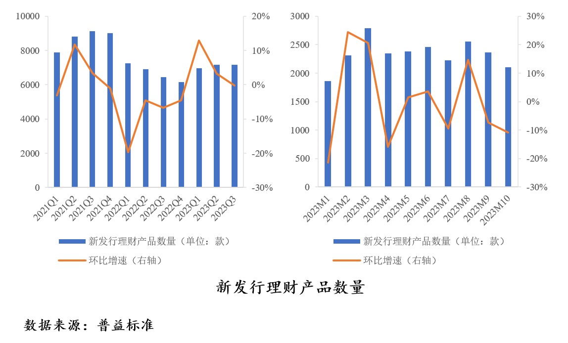 2023年前三季度,银行理财产品呈现以下主要特点:一是产品发行企稳回升,业绩基准震荡下行。二是2023年前8个月“固收+”产品发行量持续震荡攀升并达到最高峰,此后则连续两个月回撤,但与去年同期相比仍实现翻倍有余。但三季度以来“固收+”产品的业绩基准均有所下滑。三是现金管理收益低迷,全国银行理财市场精选50款六个月投资周期产品收益震荡下行,一年投资周期产品三个月和六个月区间收益率之差有所收窄。