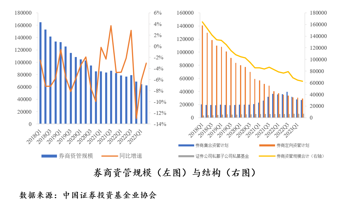 截至2023年二季度,券商资管规模总量下滑。从总量上看,作为通道业务重灾区的券商定向资管计划规模持续压降,而券商集合资管计划规模已经超过定向资管计划规模,这意味着新的发展动能正逐渐取代旧的发展动能。