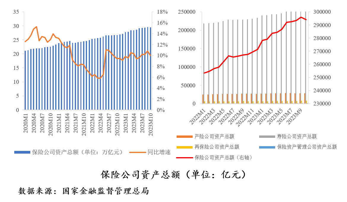 从行业表现来看,2020年以来,保险公司资产总额总体上保持震荡增长态势。保险资金运用余额的变化主要受投资余额影响,二者的变化趋势基本保持同步,而银行存款余额则维持稳定。