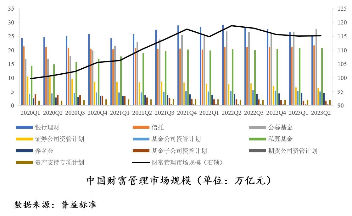近日,由西南财经大学信托与理财研究所和普益标准共同编写的《2023中国财富管理市场报告》(以下简称“报告”)发布。《报告》以财富管理市场发展概况开篇,从银行理财、信托、公募基金、私募基金、券商资管、保险资管六个方面详细分析各资管子行业的发展现状,继而从宏观经济、资金端、资产端、机构端四个维度对中国财富管理市场发展逻辑进行全面、透彻的解读,最后基于前述分析对中国财富管理市场进行展望,为观测中国财富管理市场发展提供重要参考。