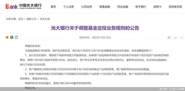 近日,光大银行发布公告称,为加强销售适当性管理,保护投资者权益,该行拟于12月19日起调整基金定投业务规则,执行定投扣款时,将增加客户风险承受能力匹配度校验。如果客户出现风险承受能力评估结果失效或低于拟定投的产品风险等级的情况,请客户及时进行风险承受能力评估。如未进行,客户将会在单笔定投委托扣款达到6次后,被暂停定投协议。在定投协议恢复前,该行不再进行定投扣款。