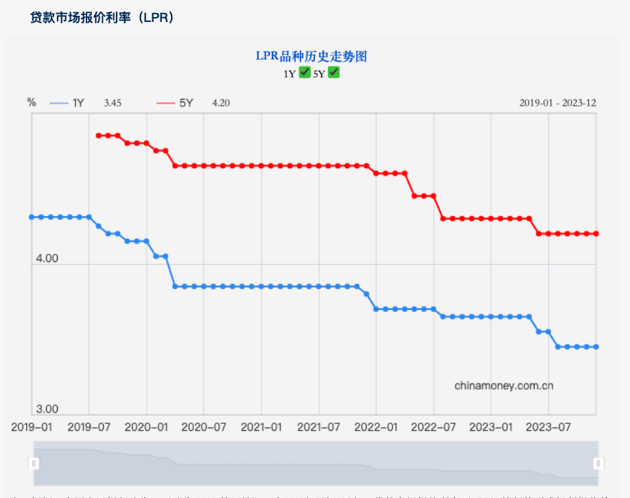 回顾2023年,LPR报价经历过两次调整。其中,2023年6月,1年期和5年期以上的两个品种同步下调10BP,报价分别是3.55%、4.2%;2023年8月,LPR非对称下调,1年期下调10BP至3.45%,5年期以上维持4.2%不变。