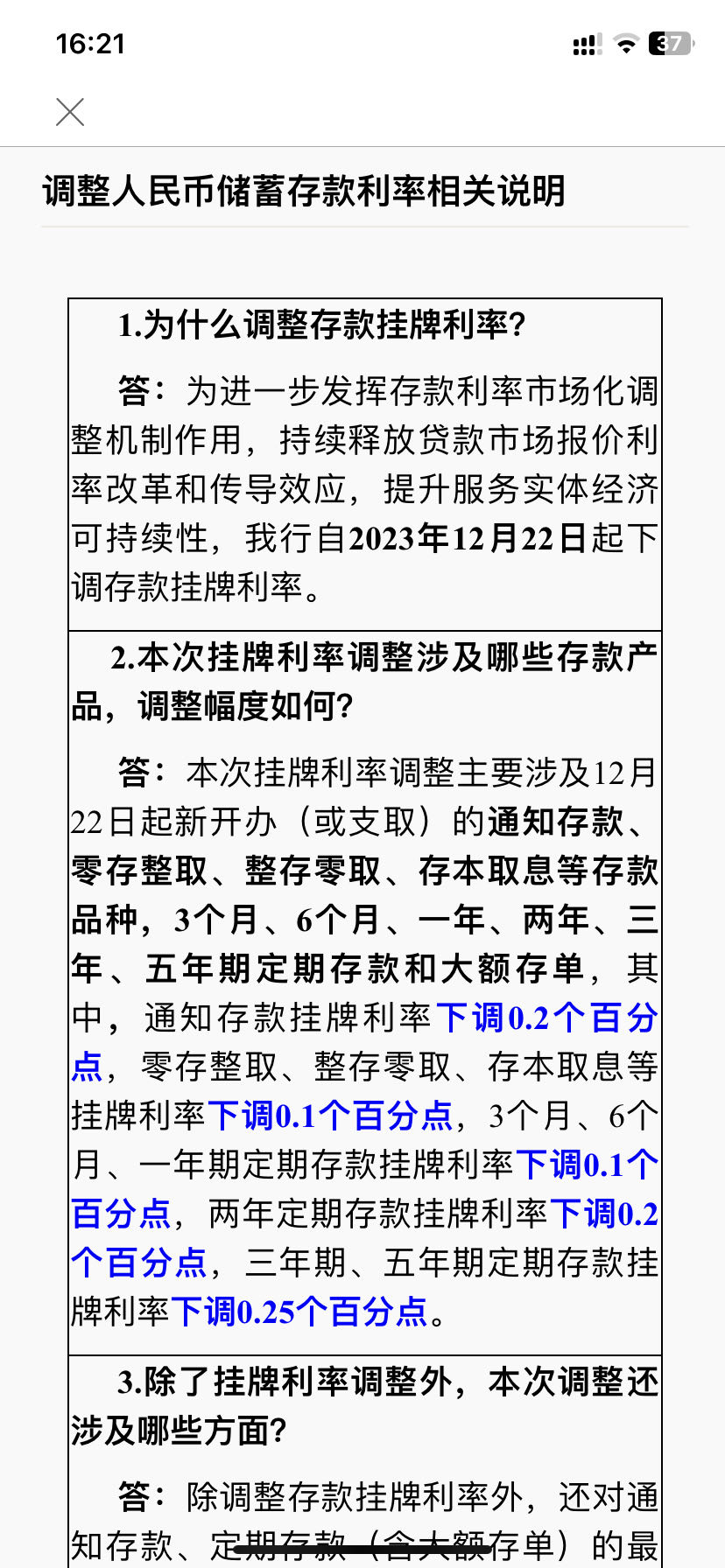 12月21日下午,工商银行app挂出《调整人民币储蓄存款利率相关说明》,称“为进一步发挥存款利率市场化调整机制作用,持续释放贷款市场报价利率改革和传导效应,提升服务实体经济可持续性,我行自2023年12月22日起下调存款挂牌利率”。