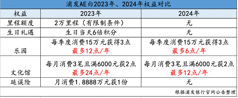 在广州某地产公司工作的李环(化名)就是其中之一。他以一款此前业内公认的“神卡”浦发银行运通美国白金卡的里程积分兑换权益举例,最初该卡可以12:1积分兑换航空公司里程,但在此后的调整中,该卡开始逐渐设置门槛,要求持卡人在限制时间内累计消费达一定金额才可按照12:1积分兑换里程,并规定最高上限为2万里程。而今年12月,该卡公告称,2024年将取消消费达标享2万里程兑换额度活动。