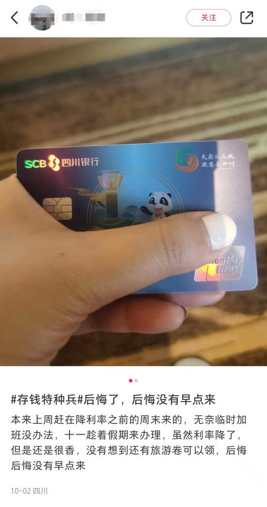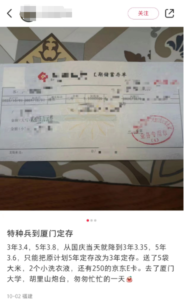 利率每高出0.1%,各地的“存款特种兵”就会多冒出来一群。刚刚过去的小长假,火的不仅是“特种兵式旅游”,省钱上头的年轻人越玩越野,打着飞的、坐着高铁来了个“bank游”,纷纷化身成为“存款特种兵”,一边旅游一边不忘开卡存款。在小红书上,就有不少用户晒出了自己国庆期间奔赴“钱”线的经历。