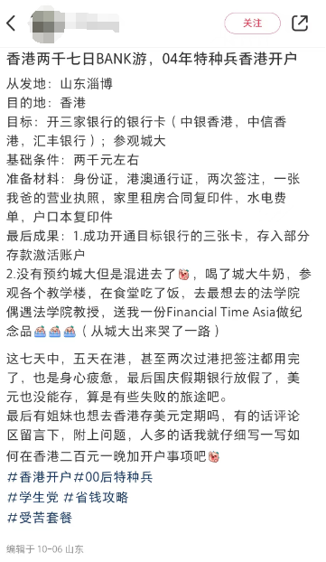 为了存钱,特种兵们各显神通。有人货比三家,从热闹的评论中“杀”出一条存钱路线。有人正在积极规划,在线求攻略、求组织、求联系方式。还有的人卷到了香港,硬生生将香港银行挤成了菜市场,在小红书上搜索“香港开户”,笔记多达3万+。