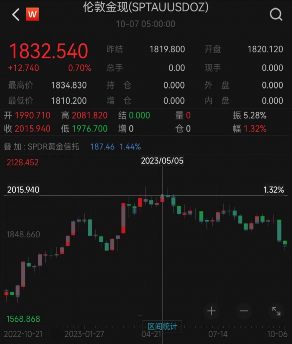 继今年5月创下历史新高后,国际金价于高位震荡数月,终于在9月下旬大幅“跳水”,从9月25日至10月5日连续九个交易日下跌,直至10月6日休市终于小幅收涨,报1832.54美元/盎司,较年内高点2081.82美元/盎司已经回落超过200美元。受此影响,国内饰品金价在中秋、国庆“双节”假期也出现一定程度下跌,部分门店的黄金饰品价格从9月600元/克左右的高点大降逾30元/克,让不少网友在社交平台上直呼“买亏了”。