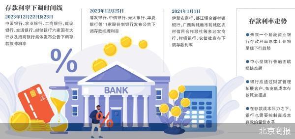 地方农商行、村镇银行等机构下调存款利率是跟进全国性银行的“补降”之举。2023年12月22日及23日,中国银行、农业银行、工商银行、建设银行、交通银行、邮储银行六家国有大行以及招商银行集体发布公告,下调存款挂牌利率,调整后,上述七家银行三年期定期存款挂牌利率从2.2%降至1.95%,五年期定期存款挂牌利率降至2%。