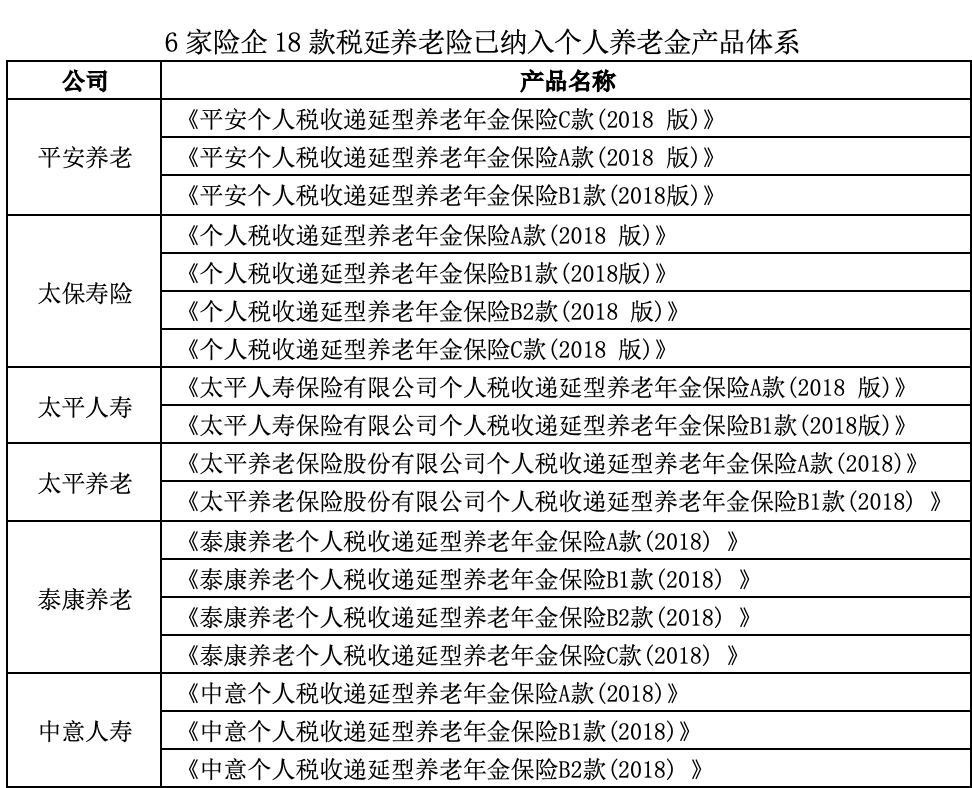 值得注意的是,在此前专属商业养老保险、两全保险和年金保险(含分红型和万能型)的基础上,已有来自太保寿险、太平人寿、中意人寿、泰康养老、平安养老、太平养老6家公司的18款个税递延型养老保险纳入个人养老金产品体系。