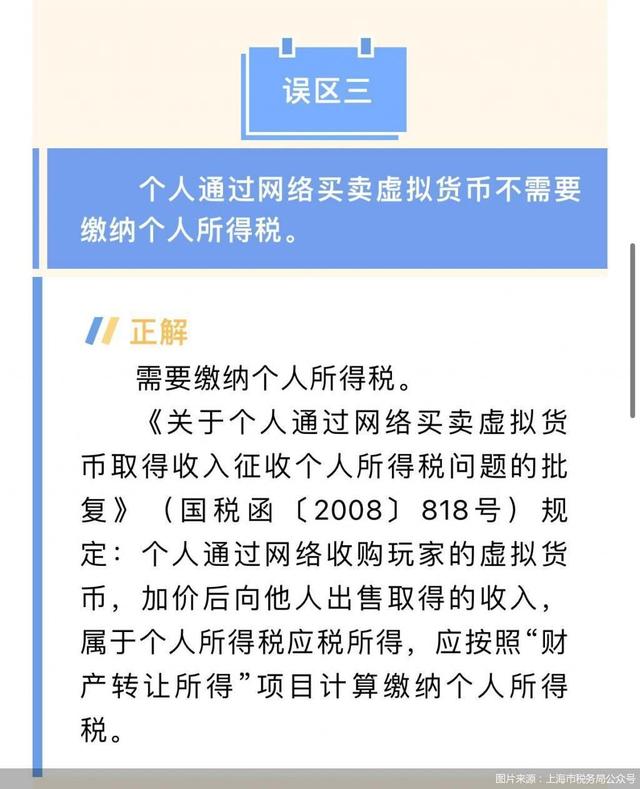 虚拟货币交易再次受到关注。1月8日,北京商报记者注意到,国家税务总局上海市税务局日前在公众号发表《个人所得税经营所得和分类所得常见误区》一文,其中指出个人通过网络买卖虚拟货币需要缴纳个人所得税,由此引发业内热议。