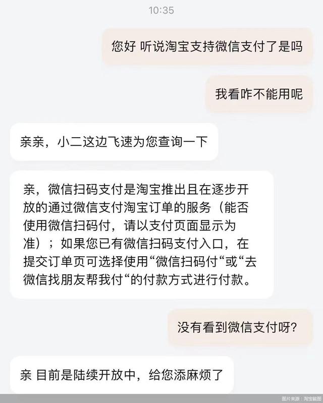 另经北京商报记者向淘宝客服证实,时隔一年半时间,上述在淘宝App购物时使用微信支付的功能,目前也仅有部分用户可使用,不过也在逐步开放中。