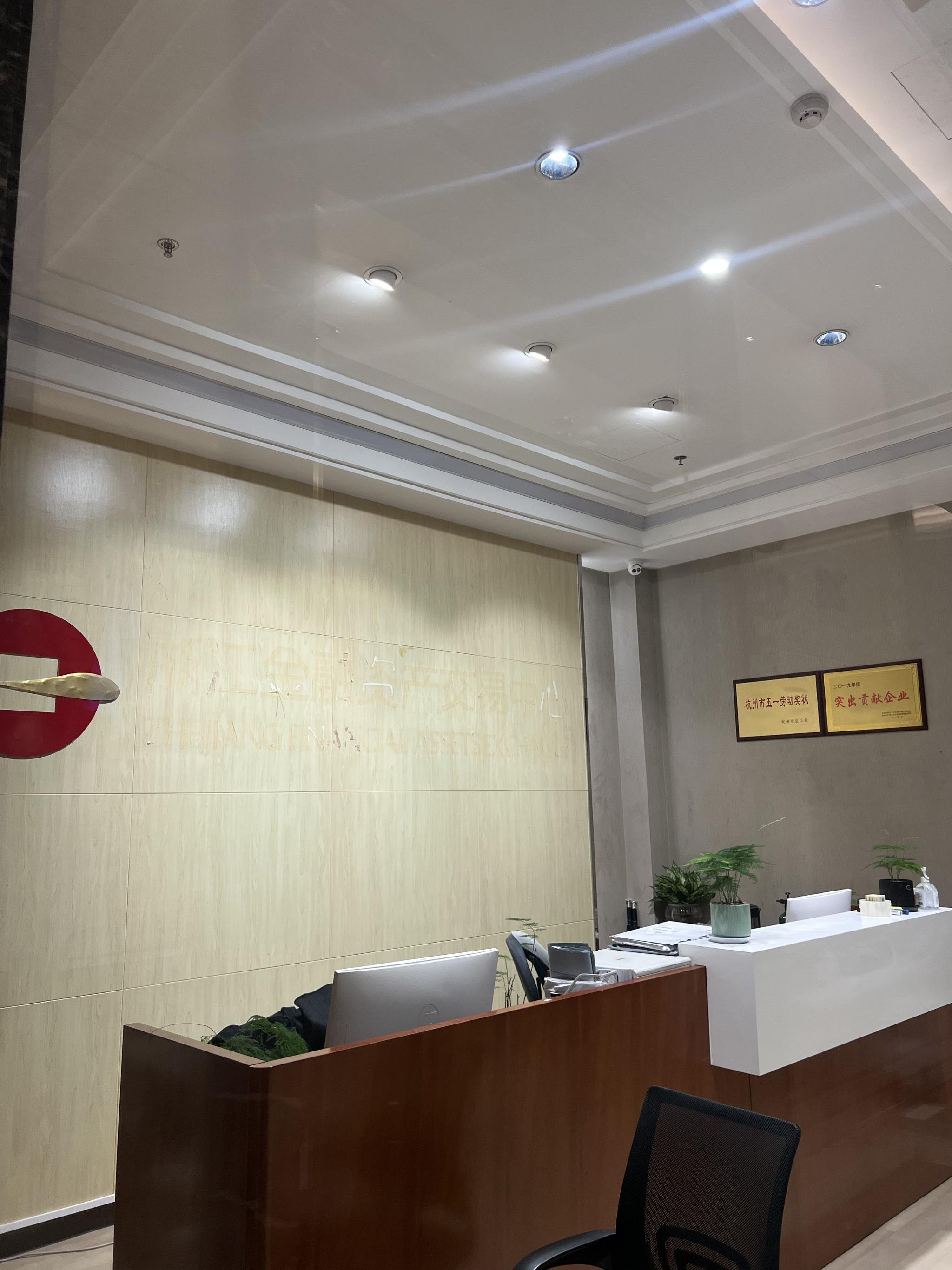 不过,前台区域已明显收缩。记者在28楼前台看到,原本挂着的“浙江金融资产交易中心”牌子已被拆下,墙上仍留有挂牌的痕迹;另一面墙上仍保留着“杭州市五一劳动奖状”“2019年度突出贡献企业”等荣誉牌匾;前台办公用品并无撤离迹象,但无人值守,仅有一名警察在现场。
