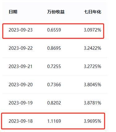 实际上,七日年化收益率的计算与万份收益息息相关,现金类产品的七日年化收益率代表一只产品7天的实际收益折合成年化收益率。如果产品某一日单日收益特别高,此后几天的产品收益通常都会呈现较高的七日年化收益。对投资者而言,在收益释放之后买入,虽然此时七日年化收益率受收益释放影响会短暂地看起来很高,但此后变会逐渐下滑至常态,投资者获得的实际收益可能有所偏差。以“稳享现金添利(乐享版)2号”为例,受9月18日1.1169较高的万份收益影响,9月23日万份收益为0.6559,该日的七日年化收益却高达3.0972%(一般对应的七日年化在2.5%左右)。