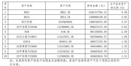 该产品前十大持仓主要集中在一月以内的回购、存款和同业存单。其中第一大持仓为R021,持有金额为21亿元,占理财计划比例为5.58%。