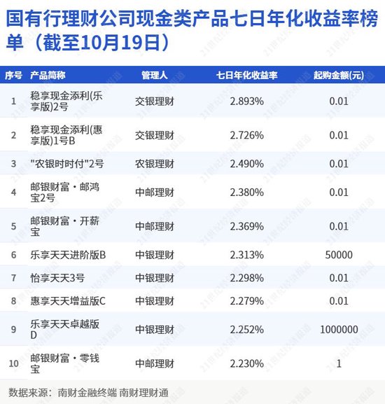 南财理财通数据显示,截至10月19日,在国有行理财公司现金类产品七日年化收益率榜单中,4家国有行理财公司产品上榜。其中,中银理财有4只产品上榜,中邮理财有3只产品上榜,交银理财有2只产品上榜,农银理财有1只产品上榜。