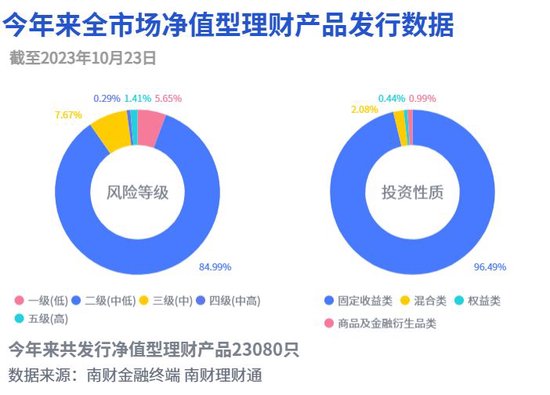 据南财理财通最新数据,截至2023年10月23日,今年来全市场已发行净值型银行理财产品23,080只(含私募产品)。