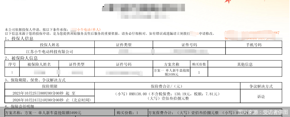 除了保费不一致和投保人资格问题,王欣欣也对小牛电动的保险业务资质提出了疑问。